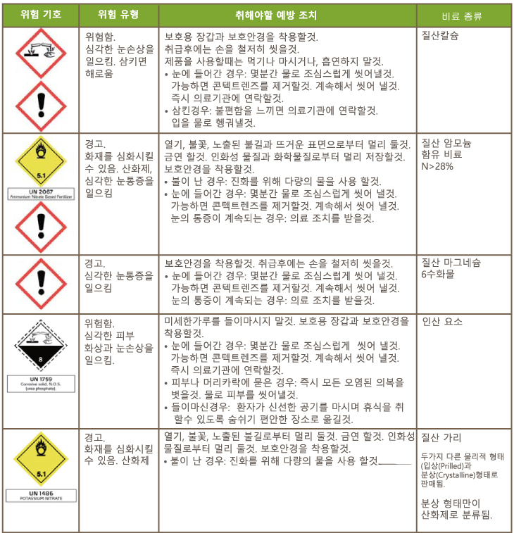 비료 제품, 비료의 생산 또는 가공처리에 사용되는 원료에 관한 정보가 올바른지 확인할 수 있는 가장 좋은 방법은 제품이 사용되는 국가의 규정에 따라 모든 정보가 종합된 안전관리지침서(SDS)의 새로운 업데이트 버전을 요청하는 것입니다. 정확한 안전관리지침서는 취급 및 저장, 원치 않는 상황 및 폐기와 관련하여 가능한 위험 및 권고에 관한 정보를 제공합니다. 정확한 안전관리지침서에는 또한 운송 등급 정보가 포함됩니다.